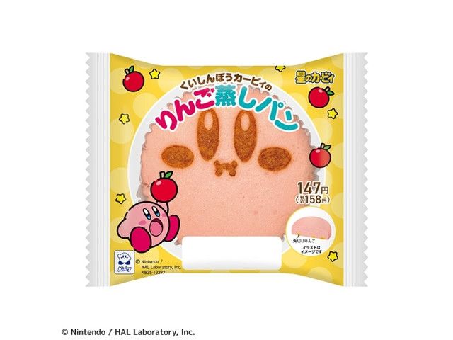 カービィも大好きなりんご味の蒸しパンです。りんごジュースで味付けした蒸しパンの底に角切りりんごを敷き、カービィフェイスの焼き印で仕上げました。