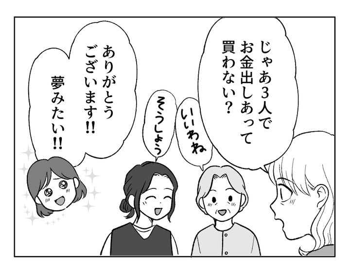 三男トモヤさんのお嫁さんであるユナさんがご懐妊との朗報に、義実家をはじめ長男家、次男家も大喜び。ユナさんのリクエストをもとに、皆で仲良く贈り物をすることにしたのでした。皆でそれぞれお金を出し合って買えば、1人では手が届かない高額な贈り物ができそうです。今からユナさんとトモヤさんが喜ぶ顔が浮かびます。アイさんもハルミさんもお義母さんも、子育てにおいては大ベテラン! ユナさんには大船に乗った気持ちで過ごしてもらいたいですね。