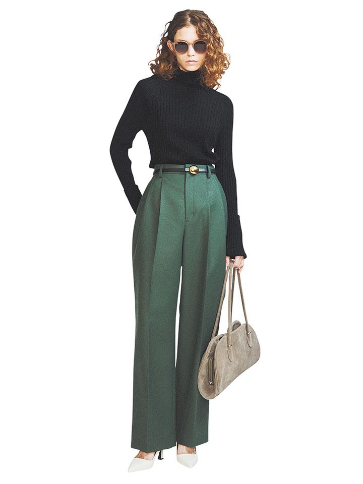 【POINT】キレのいいニットとパンツで堂々とシンプルに。ゴールドバックルのベルトや鋭いまっ白パンプス、モダンなフォルムのレザーバッグなど凝ったデザインの小物で無難に見せないテクニック。結果、ワンツーのシンプルさもさらに引き立つ相乗効果も。