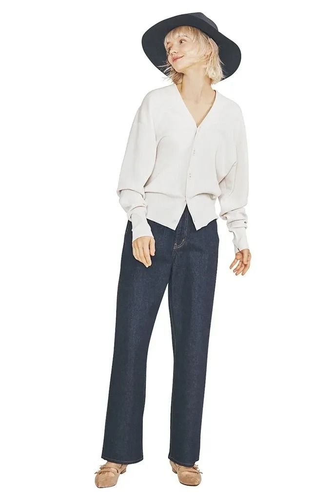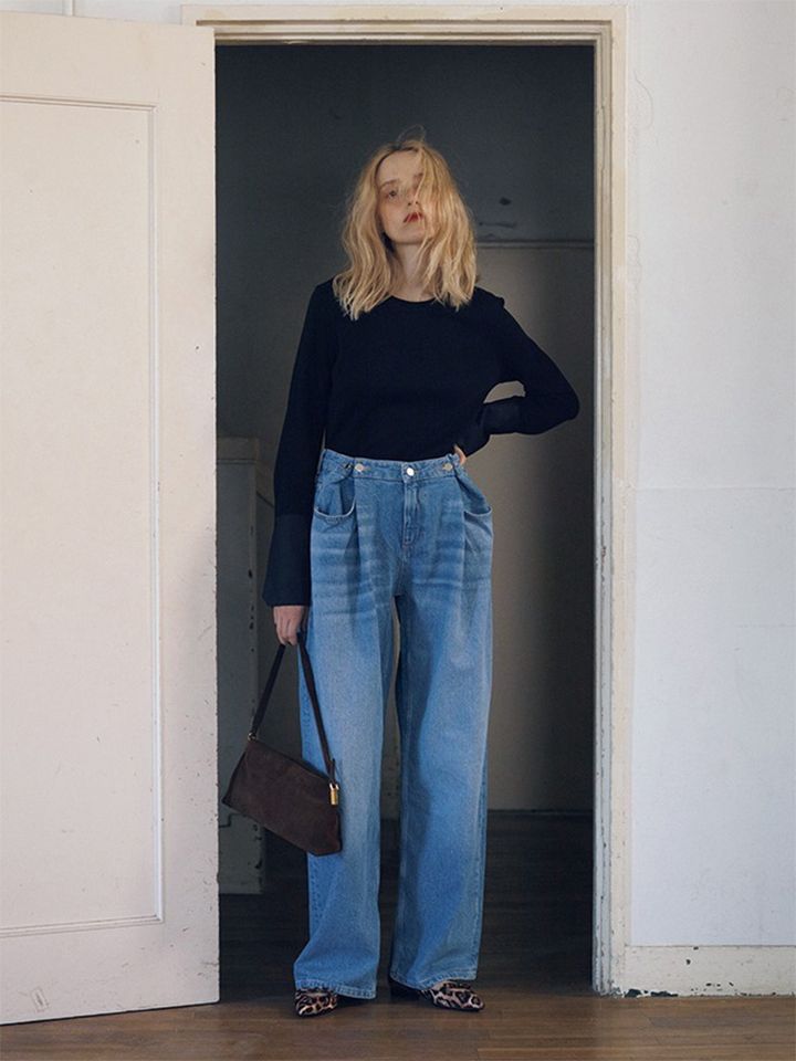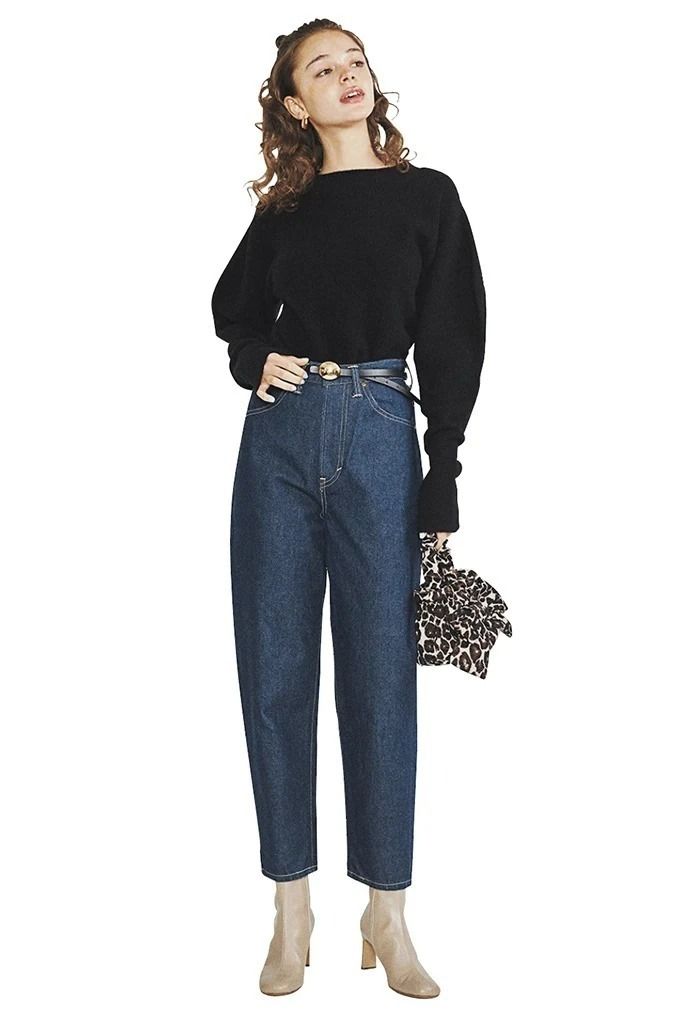 コンパクトなリブ編みながら、そで口にだけアクセントをもたせたキレよく着られる黒ニット。デニムはトップスインがさまになる、つまんだようなタックのディテールで、地味とはまた違うシンプルなたたずまいに。