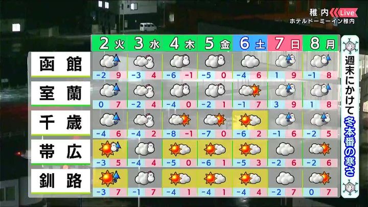 日本海側では、あす2日(火)夜から週末にかけて積雪が増えていくでしょう。札幌やオホーツク海側は大雪になる可能性は低いですが、木曜は各地で最高気温が0度に届かない「真冬日」の予想で寒くなります。
