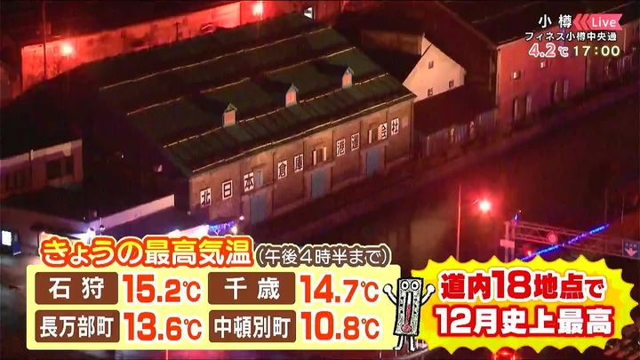 そして、この風が暖かい空気を運んできて、きょうは気温が上がりました。15.2度と道内で最も高くなった石狩や千歳、渡島北部の長万部町、宗谷南部の中頓別町など、道内18地点で12月の観測史上最も高い気温となりました。