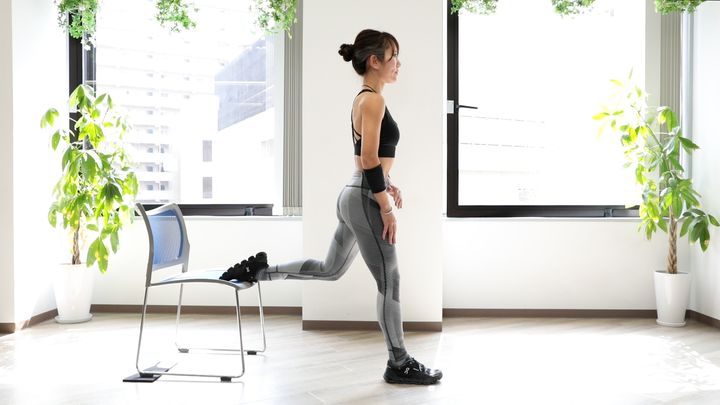 2. イスに片足の爪先か足の甲を乗せ、背筋を伸ばす(反対側の脚は前方に出す)