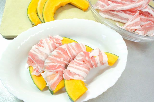 2. 1のかぼちゃに豚肉を巻き付けます。