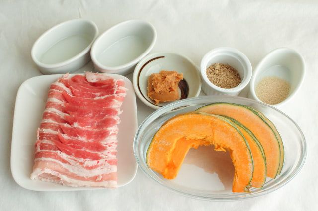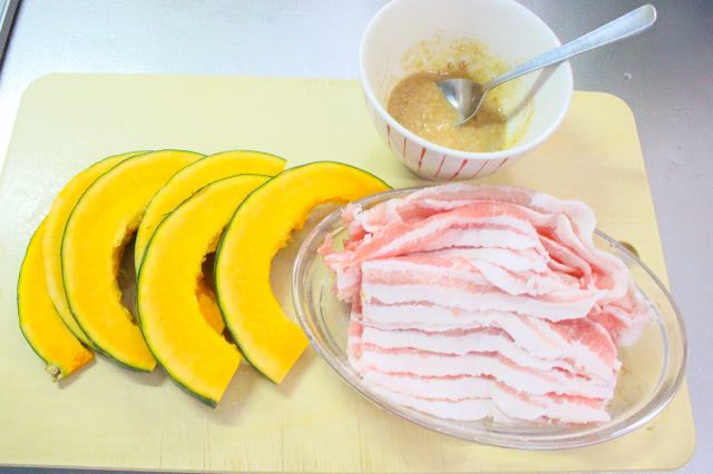 1. わたを取ったかぼちゃを7mm幅に、豚肉は長さを半分に切り、みそ、ゴマ、酒、みりん、砂糖を混ぜ合わせます。
