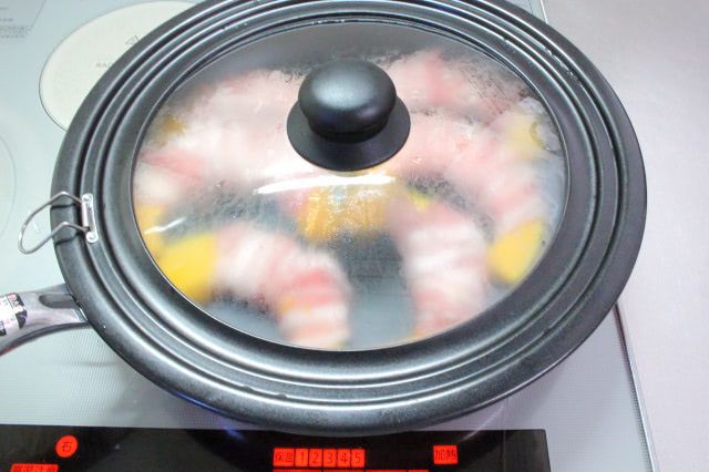 料理研究家・上田淳子さん考案の「カボチャの豚ばら巻き焼き みそだれ添え」は、コールドスタートでフタをして焼くのがポイントでした。