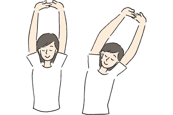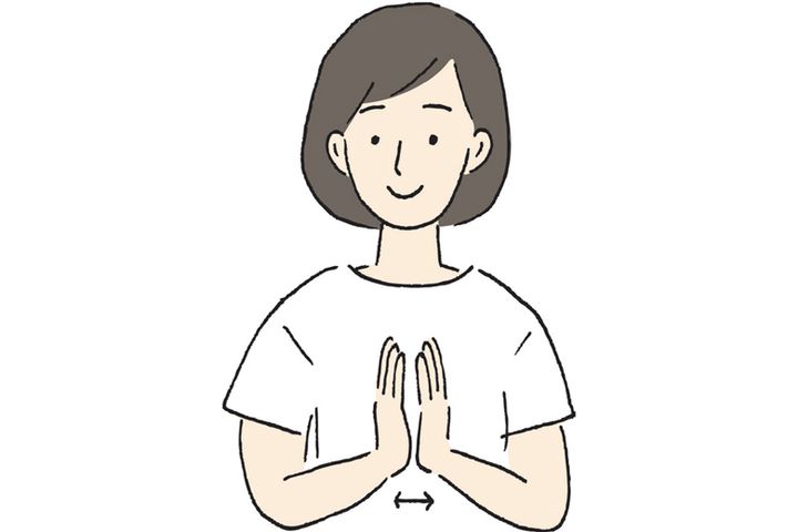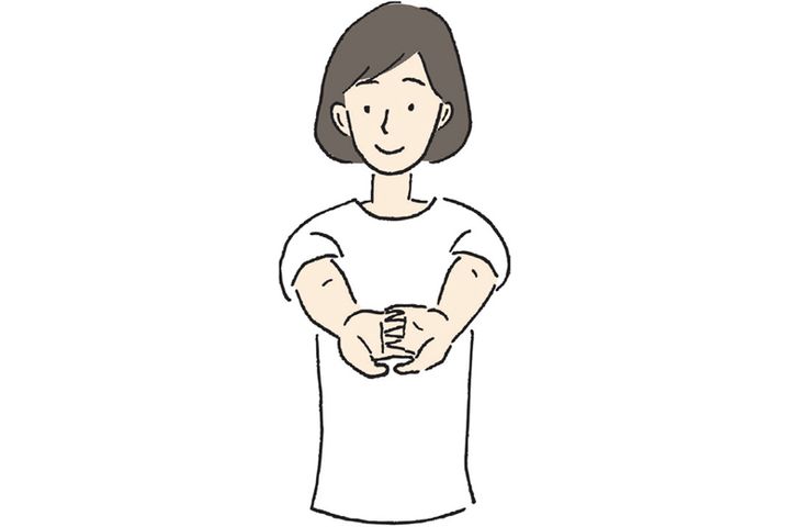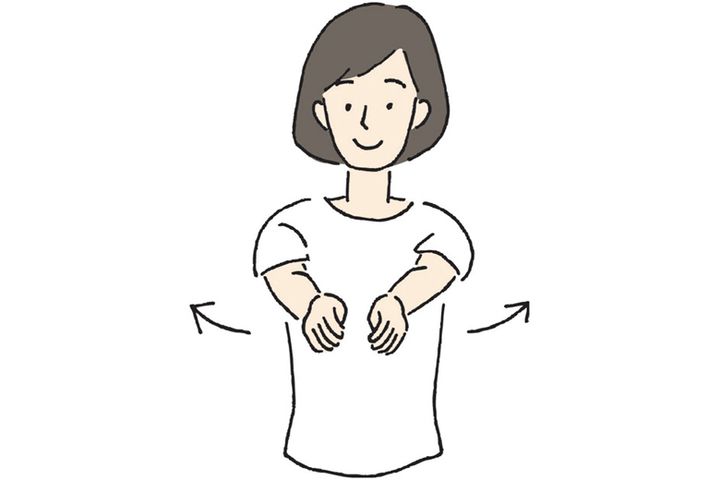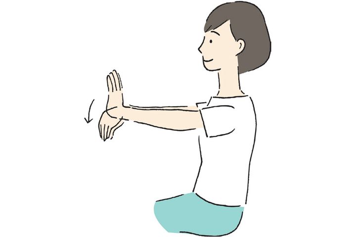 合掌した手を離して両手を前に出し、息を吐きながら手首を上に曲げ、手のひらを正面に向けます。今度は息を吐きながら手首を下に曲げ、指先に力を入れて自分の方へ向けます。これを交互に繰り返すと、手首から腕にかけて熱くなるはず。