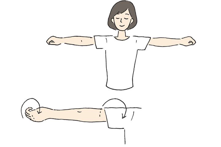 息を吐きながらこぶしの小指を上に向けるよう手首とヒジ、肩を内側から外側へひねり回します。回したら息を吸いながら元に戻します。腕にどういった変化があるか観察しましょう。