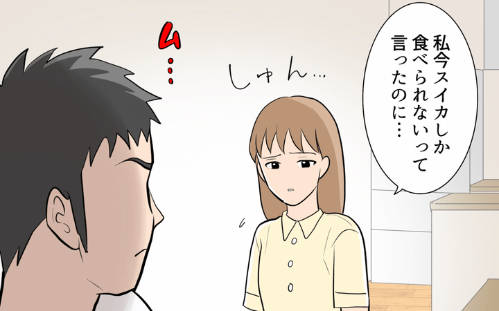 ■これまでのあらすじ つわりに苦しむ妻に向かって「食事中に気持ち悪そうにしているのはマナー違反」と言い出した夫。食べ物のことになると見境がつかなくなる夫に妻が怒りを露わにすると、夫は慌ててご機嫌を取ってきた。翌日、夫は妻がリクエストした「スイカ」を買って帰宅するが…。