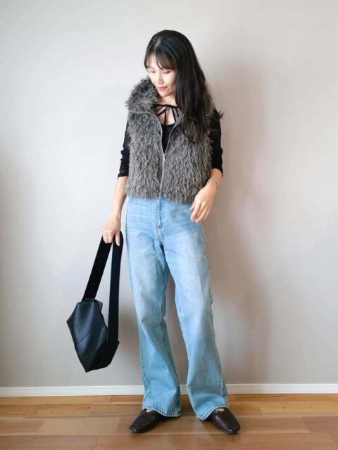 きれいめ・カジュアルどちらのコーデにも合うのが「毛足の長いファーベスト」。羽織るだけでサマになりますよ。ボリューミーなベストですが、下にぴったりめのプルオーバーをインすると着膨れせずコーデがスッキリ。