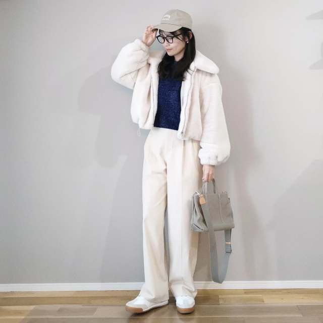 ふわふわのボリューム感に加えて丈感がコンパクトなので、大人可愛いムードたっぷり。今シーズン流行りのワイドパンツとも相性バツグンです。