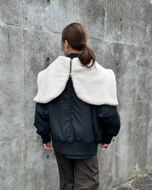 カジュアル派さんにおすすめなのが、ボアが入ったフライトジャケット風のデザイン。フェイクレザーやナイロン地にボアを合わせた辛口なアウターは、ラフなパンツにぴったりマッチ。暖かい着心地でハンサムなルックスに決まる一枚です。