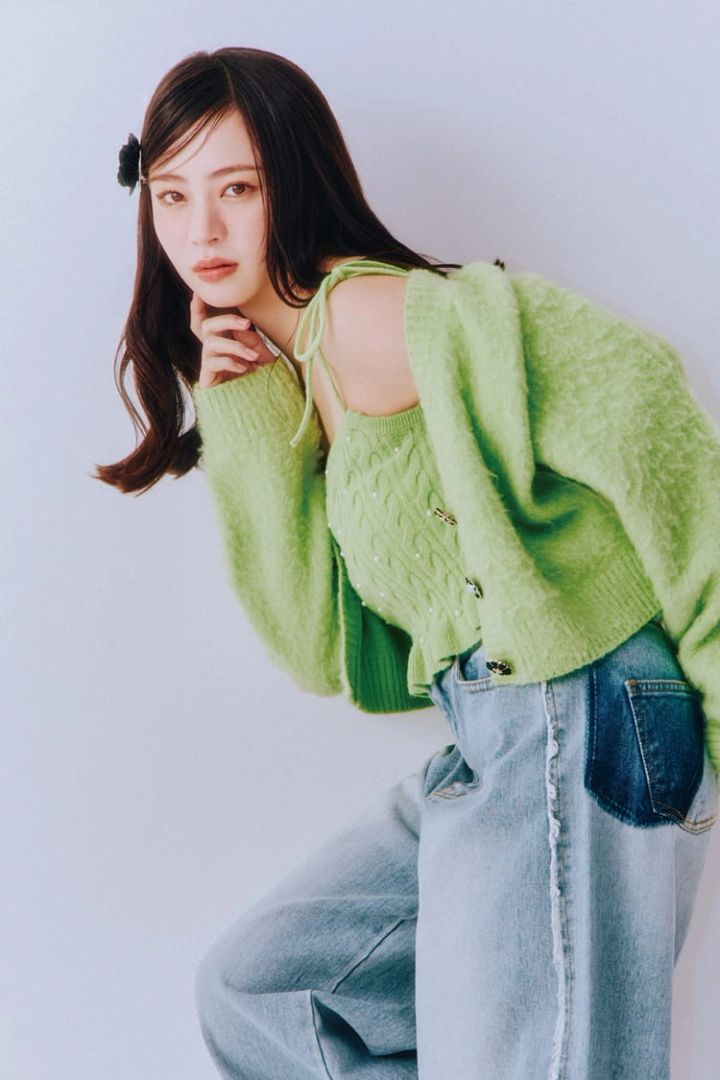 グリーンアンサンブルニット 23,980円/LILY BROWN デニムパンツ 19,800円/The Girls Society ヘアピン 2,310円/GOLDY ローファー/スタイリスト私物