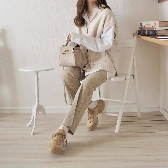 スナップで着用しているニットベストのブランドは>>GU(ジーユー)