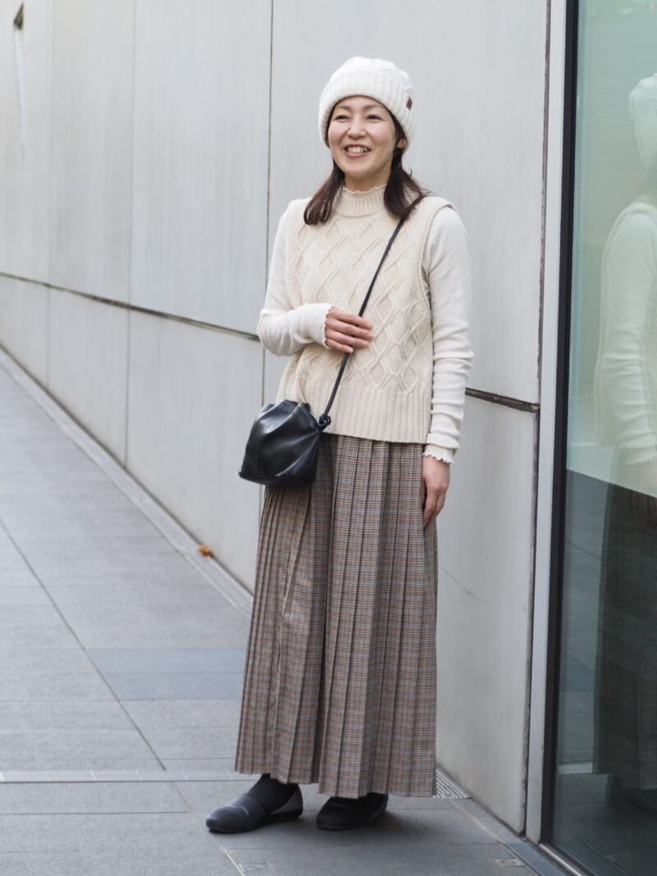 ニットベストにチェック柄のロングスカートを合わせたナチュラルな装いに身を包み、代官山を散策中のあゆみさんを直撃。やわらかいミルキートーンの色みがお似合いです。「『北欧、暮らしの道具店』の雰囲気が好きで、スタイリングの参考にしています」。細かなプリーツスカートが揺れ、動きのあるスタイリングに。