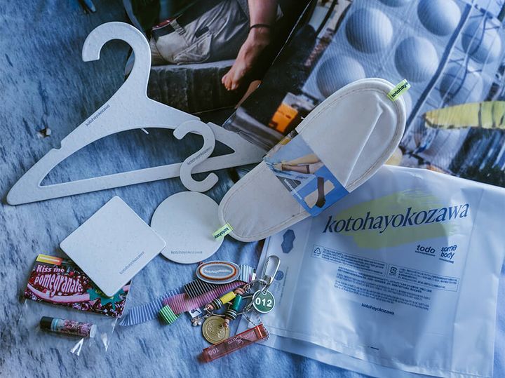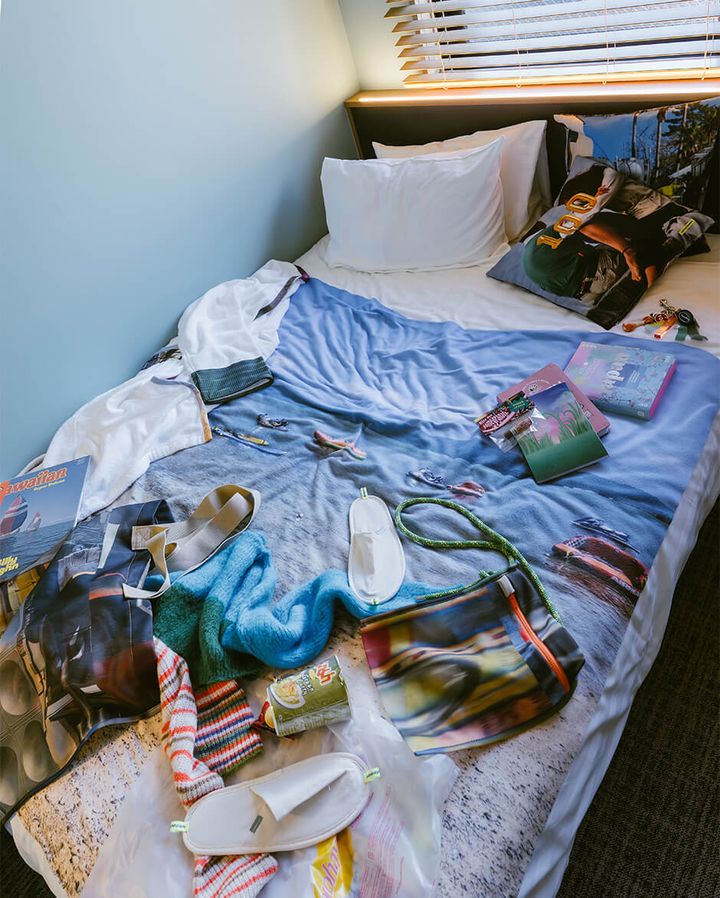 今回のためにデザインされたホテルアメニティの一部はギフトセットとして持ち帰ることができ、過去のコレクションで使用した残布や端切れから作られたルームウェアやルームキーなど、ブランドの空気を感じられるアイテムも揃う。