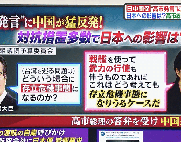 事の発端は、11月7日に行われた衆議院予算委員会での高市総理の発言。立憲民主党・岡田克也元外務大臣の「(台湾有事は)どういう場合に(日本が)存立危機事態になるのか?」という問いに高市総理は、「戦艦を使って武力の行使も伴うものであれば、これはどう考えても存立危機事態になりうるケース」と答えたのだ。