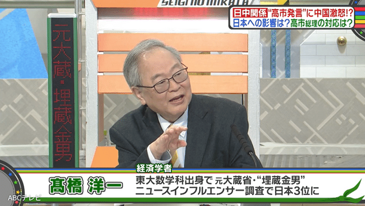 “ひろゆき&ホリエモンに続くインフルエンサー第3位”髙橋洋一氏「中国からナメられる」「安倍さんが言っていた」高市総理を支持