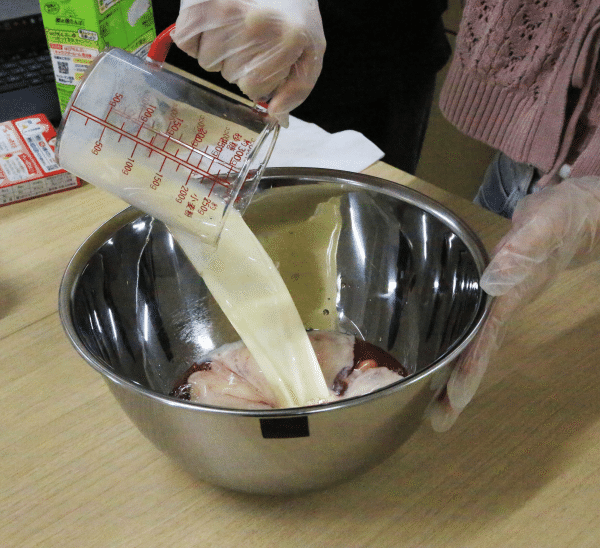 次に、安くて子どもに人気がある駄菓子「うまい棒」で定番の「コーンポタージュ」味を使った料理ができないか考えました。最後は小学生の時よく食べていたフルーチェを選びました。コーンポタージュもフルーチェも「牛乳」が必要ですが、災害時には、生ものの保存が難しいため、代わりに保存期間が長い「豆乳」を使用しました。