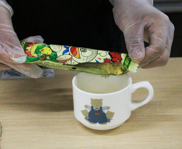 1.うまい棒を砕き、粉状にしてカップに入れます。