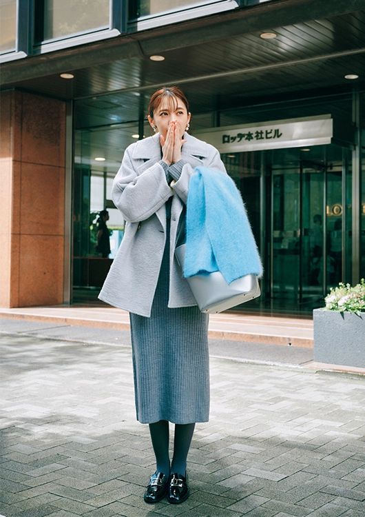 雪がちらつくほど寒くなるなんて、コートおろしてきて大正解。服はグレー、バッグはシルバーのワントーンでまとめたら、差し色兼防寒用にブルーのストールをプラス。これから厳しい冬シーズンだけど、あったかグッズがあれば大丈夫!