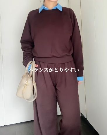 このスウェットは、カジュアルすぎないデザインで、スカートやきれいめパンツにも合わせやすいのが魅力です。 トップスに選んだ深みのあるダークブラウンに、ボトムスにはユニクロの「スウェットワイドパンツ」3,990円を合わせてセットアップに。インにブルーのシャツを合わせて襟と袖を見せることでバランスをとり、リラックス感があるのにきれいに見える着こなしです。スウェットがクロップド丈なので、脚長効果も期待できるバランスの良さが特徴です。