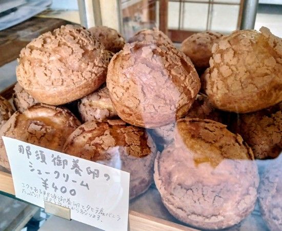 那須御養卵のシュークリームと書かれています。御養卵はコクがあるそう。重ねていても形が崩れていませんね。外側しっかり食感のようです。