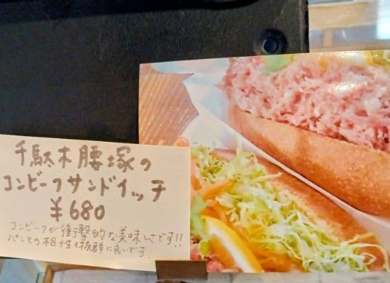 千駄木越塚のコンビーフサンドイッチなるものの写真がありました。調べてみましたら千駄木越塚という老舗のお肉屋さんで、上質なコンビーフが人気だそう。ケのハレは良い食材を使っておいしくアレンジされているのですね。