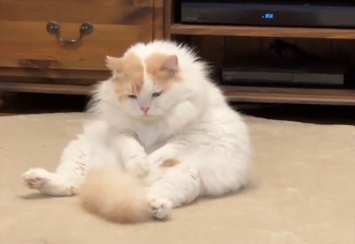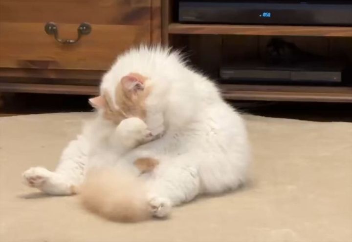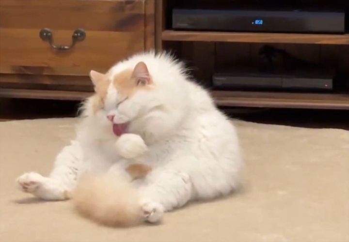 それでも毛づくろいはしたいようで、今度はおててをペロペロ。 今度はどこを毛づくろいするのかと思えば・・・