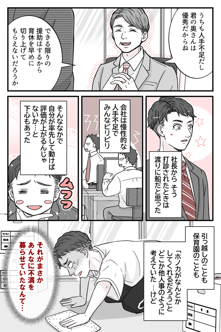 俺はショウタ。社長から「ホノカの早期復帰を検討してほしい」と言われて、「必ずそうします」と答えた。ホノカはOKを出してくれると思っていたし、社長に気に入られたいという気持ちもあった……というか、それがメインだった。俺の顔を立てるためなら、きっとホノカだって喜んで言うことを聞いてくれると思っていたんだ。嫌がるホノカに無理やり言うことを聞かせて、強引に引っ越しをした。引っ越してしまえばこっちのもんだとも思っていた。だけどこの引っ越しのせいで、夫婦間に溝ができてしまった……。