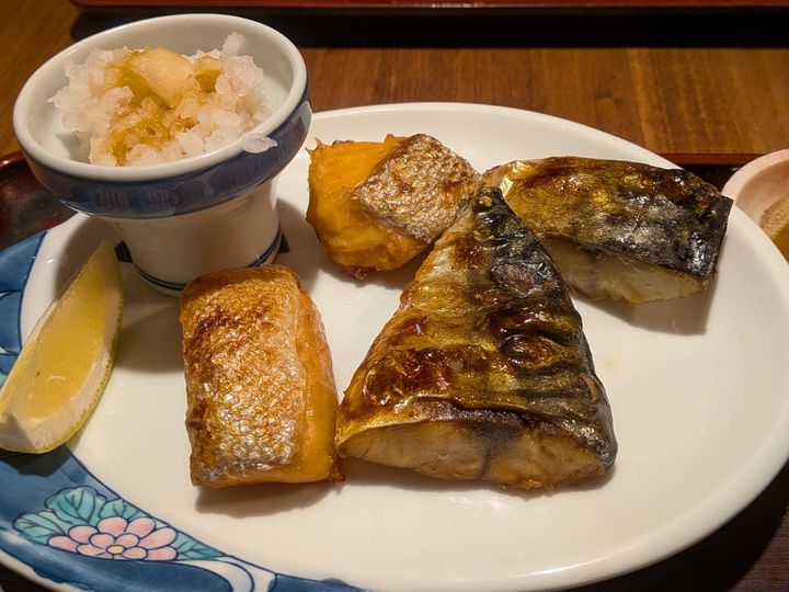 焼魚は皮がパリッ、中はふっくらジューシー。特にサバの脂のりが最高で、噛むたびに旨みが広がります。鮭もやさしい塩加減。