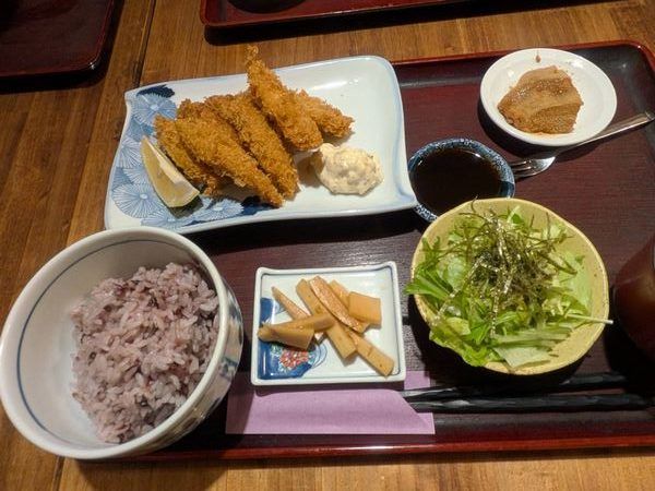今日のランチは焼魚に決定!黒米ごはんが相性抜群