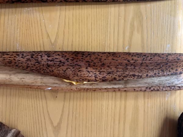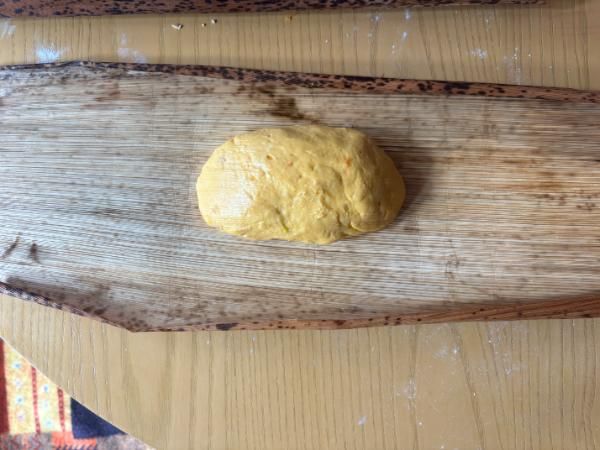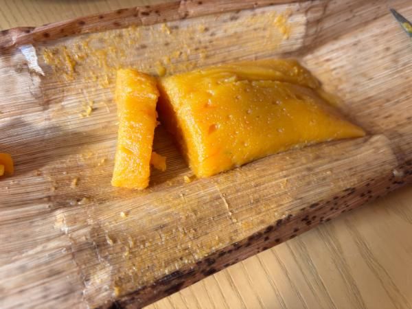 【材料】(3本分) かぼちゃ…400グラム もち粉…200グラム 薄力粉…75グラム 島ざらめ…120グラム 竹の皮…4枚(皮3枚・紐用1)