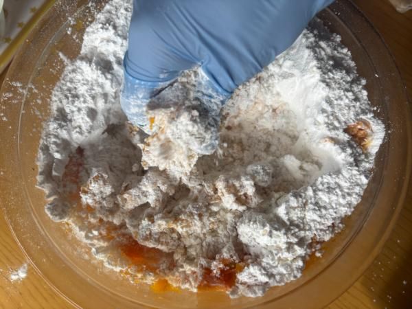 3.2の中に、もち粉・薄力粉・ざらめを入れて、ひとかたまりになるまでこねる。