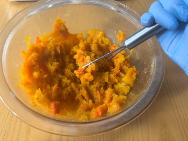 2.かぼちゃはマッシャーなどを使うか手でつぶす。