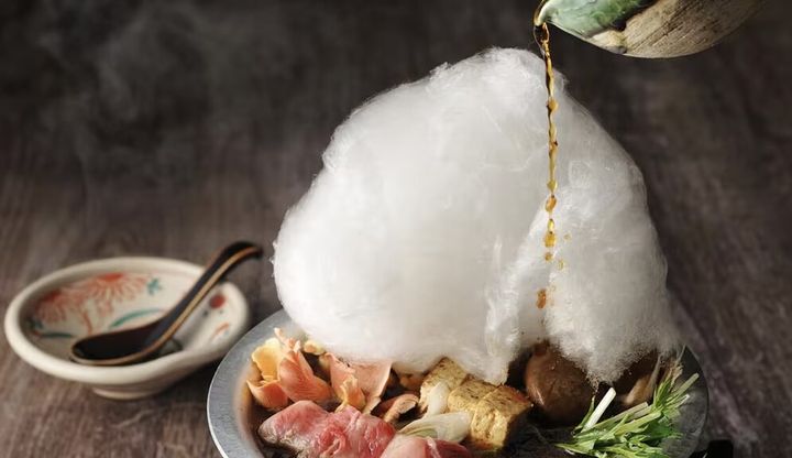 鍋の上に乗せられたふわふわの綿あめは、北アルプスの雪解けをイメージしたもの。