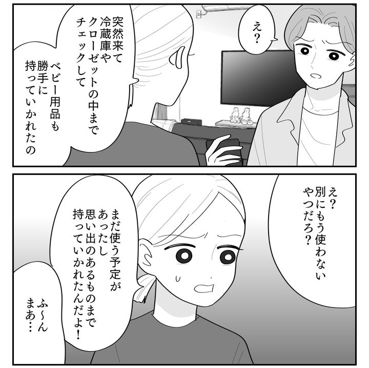 私はミサト。夫ヒロトと、1歳の娘シオリがいます。義母は車で20分ほどの場所で1人暮らし。シオリが生まれてからは頻繁にわが家を訪れ、ズカズカと生活に入り込んでくるようになりました。冷蔵庫には義母が持ってきた野菜が詰め込まれ、クローゼットの中は物を持ち去られてスカスカ。壁に掛けられたカレンダーには、義母が勝手に申し込んだ、幼児向け英語教室の体験レッスンの予定が書き込まれて……。グッタリした私は、窮状を夫に訴えました。