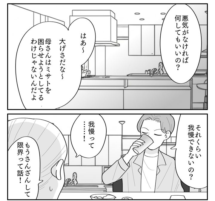 けれど夫は「母さんに直接言ったら可哀想」などと、義母の肩を持ったのです。可哀想なのはむしろ、生活を乱されている私やシオリの方じゃないの? さんざんしてきた我慢も「そのくらいのこと」と言われてしまって、私はどうしたらいいのかわからなくなってしまったのでした。