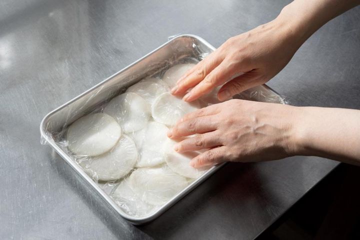 【1】かぶは3mm幅くらいにスライスし、塩をまぶす。ラップをかけて密着させ(写真下)、しばらく置く。