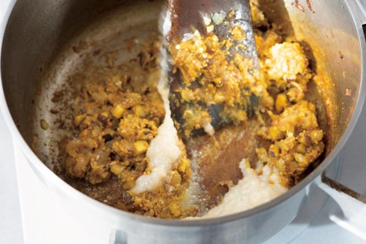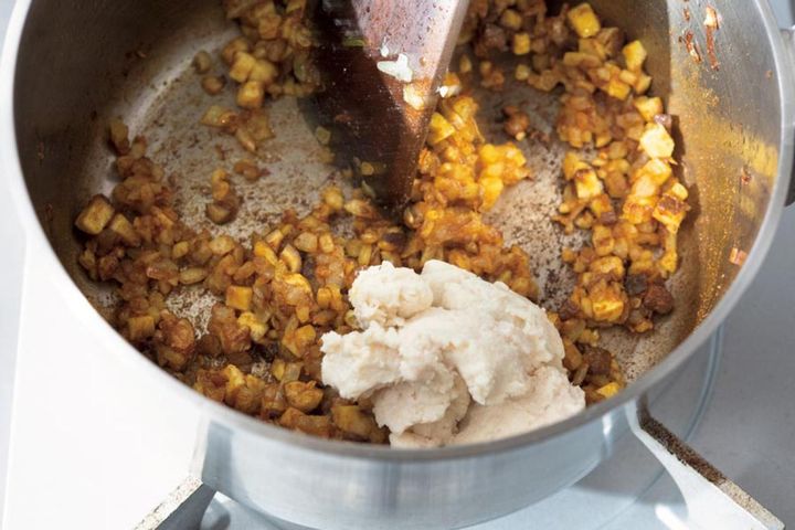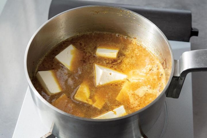 【5】豆腐をひと口大にカットして加え、中火で20~25分ほど、焦げないようにときどき鍋底を混ぜながら煮込む。とろみがついて豆腐が固くなったら、味をみて塩(分量外)で調える。