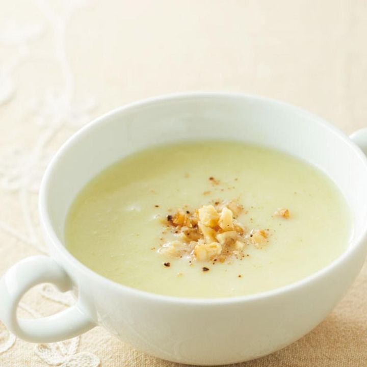 野菜を煮るときに鶏がらスープの素少々も加え、仕上げに豆乳1/2カップを加えて弱火で温める。ポタージュに仕立て、好みで刻んだくるみ適量を添え、黒こしょうを振る。