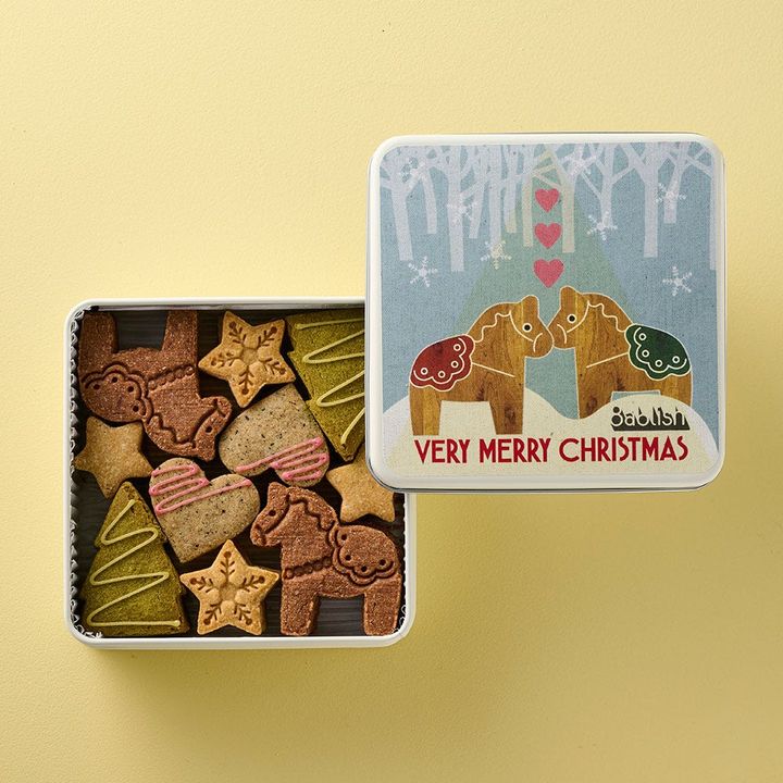 ヴィーガンスイーツが人気の「エイタブリッシュ」から、クリスマス限定のグルテンフリークッキー缶が登場。 缶を開けると、馬やもみの木、星など、クリスマスを象徴する愛らしい形のクッキーがぎっしり。抹茶やダージリン、ココア、スパイスなど、風味豊かなフレーバーがそろっている。冬の森に寄り添う馬を描いた缶は、落ち着いた上品さが漂い、ギフトにふさわしいクッキー缶だ。
