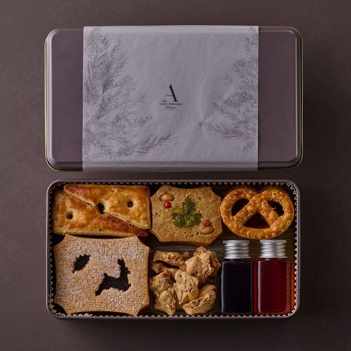東京・等々力の人気店「パティスリィ アサコ イワヤナギ」では、クリスマスケーキやシュトーレン、デリなど、ホリデーシーズンを盛り上げるコレクションが登場。注目は、飲み物とのペアリングをテーマにした「アミューズブッシュ缶」。クッキーと相性の良いドリンク用のシロップをセットにした、ユニークな一品だ。缶の中には、オーストリア・リンツ地方の伝統菓子をサブレ風に仕上げた「サブレリンツァー」や、濃厚な風味が広がる「フォアグラショートブレッド」、チーズと黒こしょう、トリュフが香り立つ「カーチョエぺぺトリュフ」など、おつまみにぴったりなクッキー5種を詰め合わせに。付属のドリンク用シロップは、爽やかな香りが広がる「カシスローズマリーシロップ」と、東ヨーロッパで親しまれる果実のコンフィチュール「ヴァレーニエ」の2種類。お酒や紅茶、炭酸水など、好みのドリンクに少量加えるだけで、クッキーとのペアリングが一段と華やかに楽しめる。