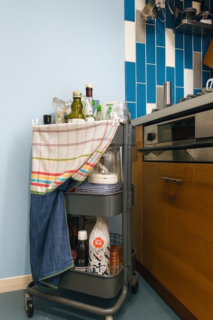 「多分これ、一家に一台あるのでは? 我が家はキッチンでサブ調理棚として活用。作り付けの収納に入りきらなかったもの、かつ頻繁に調理につかうもの(オイル、みりん、料理酒など)を収納してますが、これがあるおかげで、レンジ周りがすっきりしてすごく重宝しています。ガス台の近くにあるのですぐに油汚れがついてギトギトになるのですが、ウッド素材のものと違って、スチールなのでいろんな薬剤を使ったり、年末の大掃除には高圧洗浄機も導入してガシガシ洗えるのも便利」