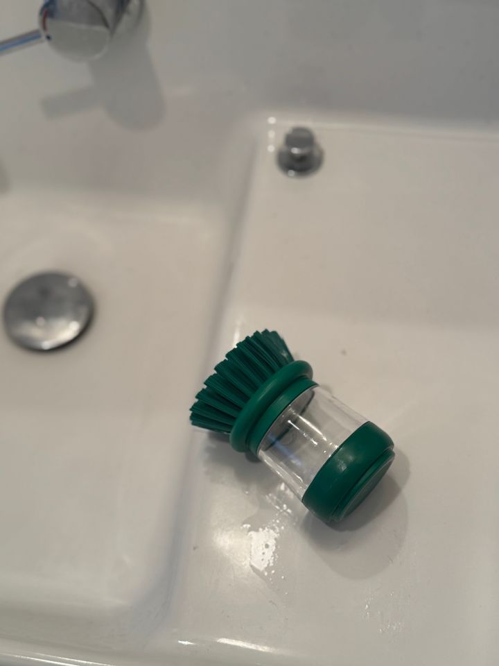 「ささやかアイテムなのですが想像以上に使い勝手がよく気に入っている“VIDEVECKMAL/ヴィデヴェックマル”。ブラシの持ち手が洗剤を入れられるようになっており、使う時はシリコン製の持ち手をプッシュ。片手でさっと洗い物ができるのでキッチン用、洗面まわり用など、場所ごとにスタンバイしています」