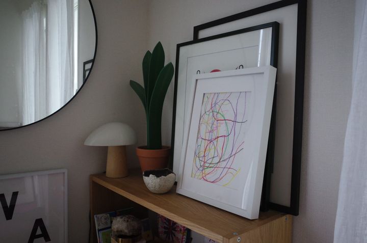 「子どもがなにげなく描いた絵をこれにはめるだけで、それらしきアートに見える!?『イケア』のフォトフレームを大小いろいろ愛用中(写真は廃盤の“RIBBA/リッバシリーズ)。繊細なドローイングにはホワイトフレーム、クレヨンや絵の具で色鮮やかな絵にはブラックフレームを選ぶ傾向が。そしてこの写真を撮るときに背景に写り込み、これも『イケア』だったか!とあらためて気づいたのがウォールミラー“LINDBYN/リンドビーン”。空間をさりげなく広く見せてくれる、我が家のステルス名品です」