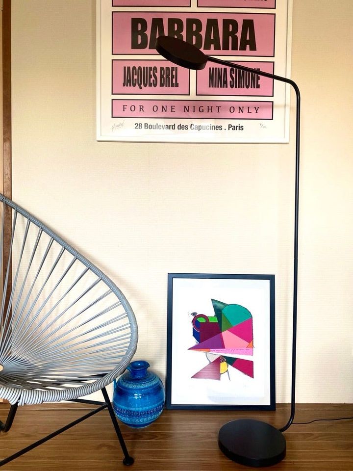 「『ヘイ』とのコラボシリーズのフロアライトを、デスクランプとして愛用中。『ヘイ』らしいミニマム・シックなデザインに一目惚れしたのですが、タッチスイッチで簡単にON/OFFできるうえ、LEDライトで実用性も抜群。アームも簡単に左右に可動するので、読書をする際にはリビングのお気に入りの椅子のそばに移動して愛用しています。床に置いた黒いフレームは『イケア』の“FISKBO/フィスクボー”。アーティストからもらったアートや子供の絵を飾るのに重宝するので、常にストックしています」
