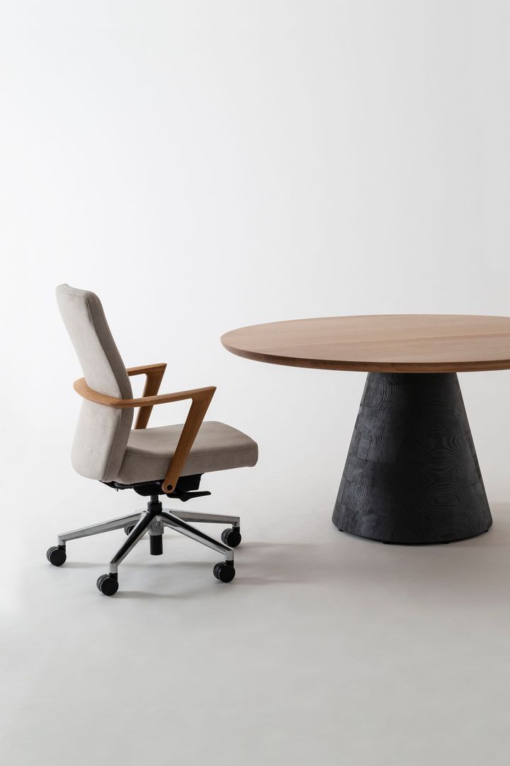 ダニエル・リーバッケンが手掛けた「アリアス」の昇降式テーブルは、温かみのあるデザインが特徴。昇降は電気を使わず、手動で天板下のベルトを回すことで脚部が伸縮する独自のシステムを採用。