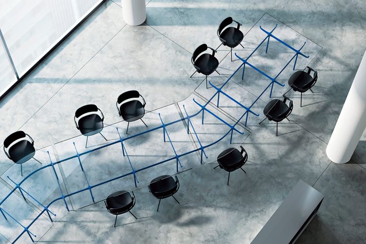 誕生したばかりのイトーキの新ブランド、「NII( ニー)」。世界的デザイナーと協業し、オフィスを魅力的な舞台へと昇華させるコレクションを展開。テーブル“CONNEXA(コネクサ)”はガラスの天板から透ける骨格のようなフレームが存在感を放つ。写真は複数のタイプを合わせたもの。