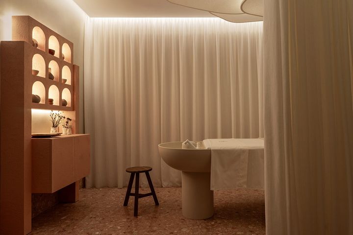 フランス人インテリアデザイナーで建築家のエマニュエル・シモンは、マドリードのローズウッド・ヴィラ・マグナ初のヘア・スパをデザインした。目指したのは、親密で静謐な楽園。オリジナルの家具が配置され、柔らかく広がる光はピンクのテラゾを敷き詰めたフロアを照らし出す。新たな感覚を呼び起こす空間だ。3種類のトリートメントには、最新のテクノロジーと施術師のマッサージ技術が融合。じっくりストレスを和らげてくれる。
